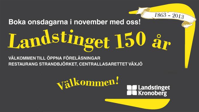Landstinget Kronoberg fyller i år 150 år. Fyra onsdagar i rad fr.o.m. 6/11 och framåt hålls det öppna föreläsningar i Restaurang Strandbjörket, vid Centrallasarettet Växjö.