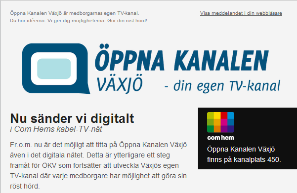 Fr.o.m. nu är det möjligt att titta på Öppna Kanalen Växjö även i det digitala nätet. Detta är ytterligare ett steg framåt för ÖKV som fortsätter att utveckla Växjös egen TV-kanal där varje medborgare har möjlighet att göra sin röst hörd.
